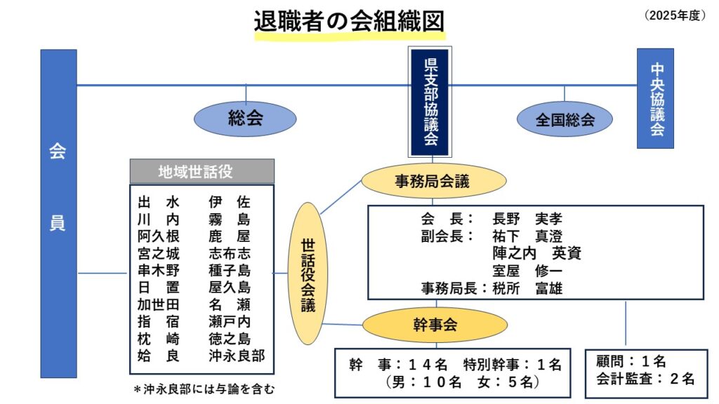 この会は、退職者会員相互の親睦を図り、健康で明るく安定した人生が過ごせるよう「ゆとり・豊かさ・社会的公正」を求め「現・退」が一体となって運動を進めていくために、1973年(昭和48年)7月31日に「全国電気通信労働組合(略称:全電通)退職者の会鹿児島県支部協議会」として結成されました。